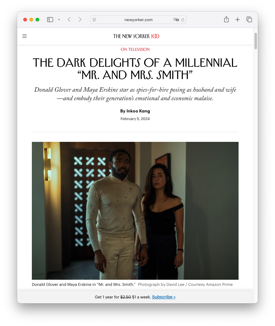 정체 불명의 스파이 조직에 따로 따로 지원한 주인공들은 John과 Jane이라는 이름을 각각 부여받고 Smith 부부로 맺어져 뉴욕에 거주하며 비밀 임무를 수행하게 된다. Jane을 연기한 Maya Erskine은 내가 몇 달 전에 우연히 알게된 재즈 밴드 Steps Ahead의 드러머 Peter Erskine의 딸이고, 일본인 모친의 인종적 특성이 두드러져 피부와 머리색, 얼굴 표정과 분위기가 영락없는 아시아인으로 봐도 무방하다. 여기에 이 창작물의 비전형적인 매력이 처음 드러나는데 기존의 첩보 영화 주인공으로 대게 키크고 늘씬한 미남 미녀 백인이 등장하는 걸 떠올려보면 이들의 프로파일은 여기서 삐딱하게 벗어나 있다.